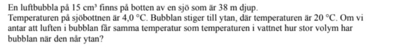 Eller lättare sagt, jag behöver nog hjälp med hur jag börjar också. Kom fram till att det är den ideala gaslagen som gäller. Men ni får jättegärna besvara frågorna ovan också så jag vet vilket tryck som gäller för vad.