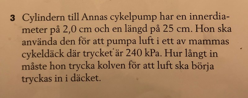 När cykelpumpen börjar trycka in luft i mammans cykeldäck är trycket 240 kPa och volymen är A·(25-l)A\cdot(25- l) där ll är hur långt Anna har tryckt in kolven.