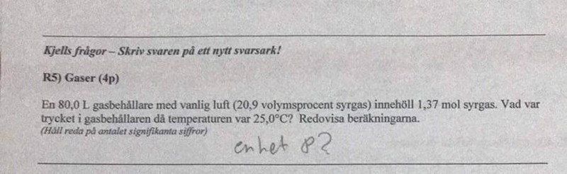 beräkna tryck av en gas behållare med 80 l luft och av luft finns det 20% O2 med 1,37 mol syrgas