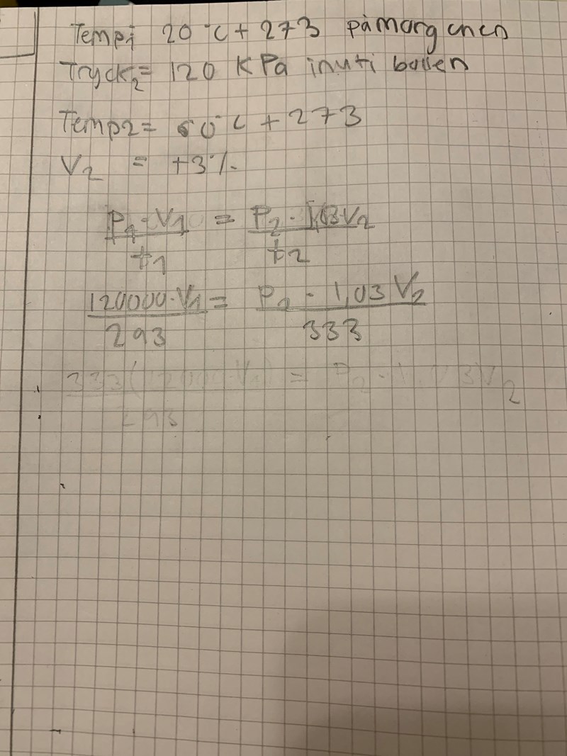 Hej! Försöker lösa denna uppgift men det går ej. Har ställt upp en ekvation, dock vet jag ej vad P2 är. Hur löser jag ekvationen? Ska jag lösa ut P2 eller? Kommer Volymen ta ut varandra under ekvationen?