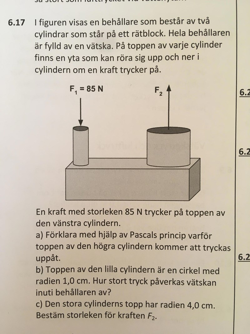Ture skrev:Börja med att räkna ut trycket i vätskan med hjälp av F1 och arean på den vänstra cylindern,