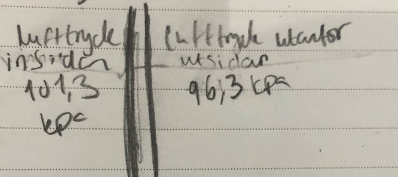 Jag tänkte att lufttrycket utanför fönstret blir 101,3-5=96,3Kpa. Därefter tänkte jag att