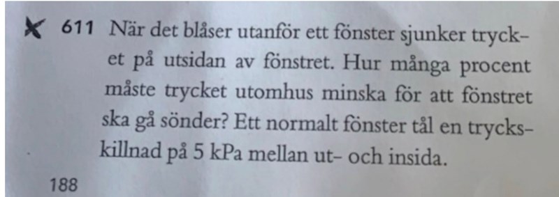 Nan frågar efter hur många % trycket utanför måste sjunka för att fönstret skall gå sönder. Det står i uppgiften att fönstret tål en tryckskillnad på 5 kPa, d v s om skillnaden mellan inne- och utetryck är större än 5 kPa går fönstret sönder. Den procentuell skillnaden är tryckskillnaden delat med utomhustrycket, d v s 5 kPa/101,3 kPa. Det är nästan samma uppgift som den om flygplanet, som du också frågat om.