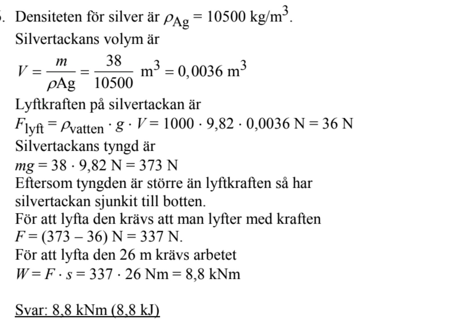 Du ger inte dina siffror, så det är lite svårt att svara på. För det kan vara så att du räknade med skillnaden av silvrets lägesenergi Epot=mgh=38×g×26=9,70 kJ.E_{\rm pot} = mgh = 38 \times g \times 26 = 9,\!70 \ {\rm kJ}. Och det skulle ju inte stämma. För då har man inte tagit med att det fanns 3,6 liter vatten som sjönk.
