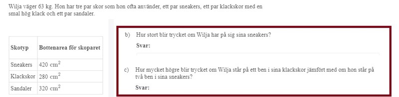 Tryck är definierat som . är trycket, är kraften (som Wilja påverkar marken med) och är arean (bottenarean på skoparet) (dessutom ska arean vara i kvadratmeter).