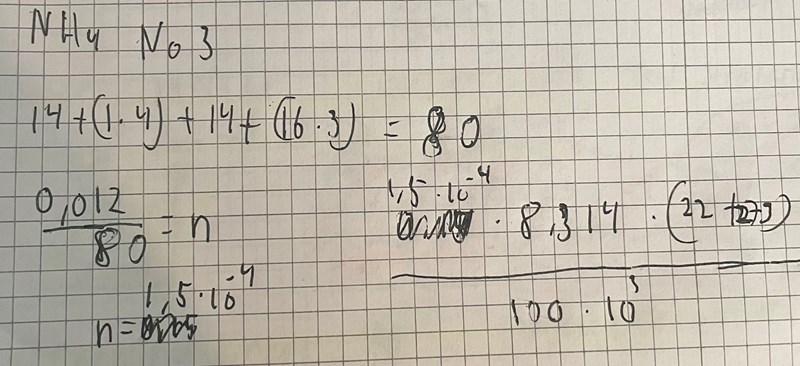 Det första felet du gör är att du inte skriver vad du håller på med. På första raden verkar du beräkna molmassan för ammoniumnitrat, på nästa rad står det 0,15, på raden därefter står det n = 0,15 skall det vara substansmängden ammoniumnitrat i mol?