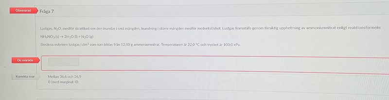 1 mol ammoniumnitrat ger 1 mol lustgas. Massan för ammoniumnitratet är redan i gram, så du behöver inte dela med 1000. När du har fått fram korrekt substansmängd sätter du in alla värden i idealgaslagen PV = nRT (tänk på att temperaturen skall vara i kelvin) så får du fram volymen i kubikmeter. Gör om till kubikdecimeter.