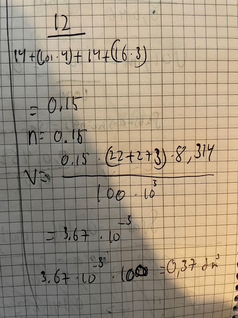Därefter verkar du använda idealgaslagen. Felet du gör är att trycket är fel med en faktor 10. Sedan gör du också fel i omvandlingen från kubikmeter till liter.