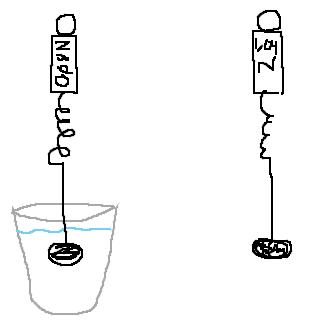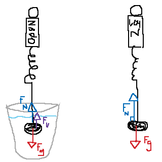 Notera att är lika stor. Dynanometern mäter vilken kraft fjädern drar med, alltså normalkraften. När stenen bara hänger är det endast tyngdkraften som fjädern måste balansera ut (rent tekniskt sett kan man säga att luften har en liten lyftkraft, men den är minimal och därmed försumbar i det här fallet). När vi sänker ned stenen i vattnet får vi däremot en lyftkraft av vattnet. Dynamometerns fjäder får alltså hjälp av vattnet, och behöver inte lyfta lika mycket. Tyngdkraften är lika stor i båda fallen, men skillnaden i fjäderns kraft är den lyftkraft som vattnet har på stenen. Hur stor är den?