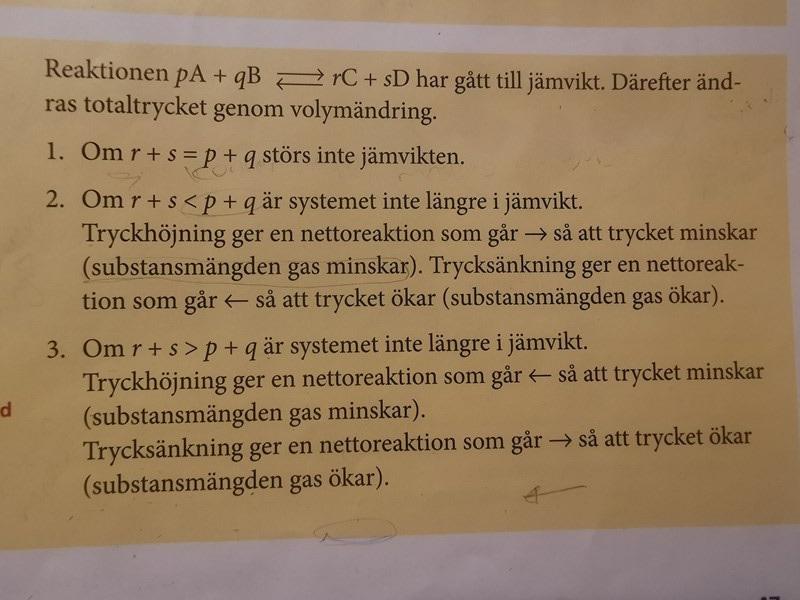 När en jämvikt störs, så ändras alltid systemet på så sätt att ändringen motverkas. Om man har en reaktion där antalet mol gas totalt minskar när reaktionen går åt höger (som i 2) , så kommer en tryckökning att göra att reaktionen går åt det hållsom gör att antalet mol gas blir mindre (d v s reaktionen går åt höger).