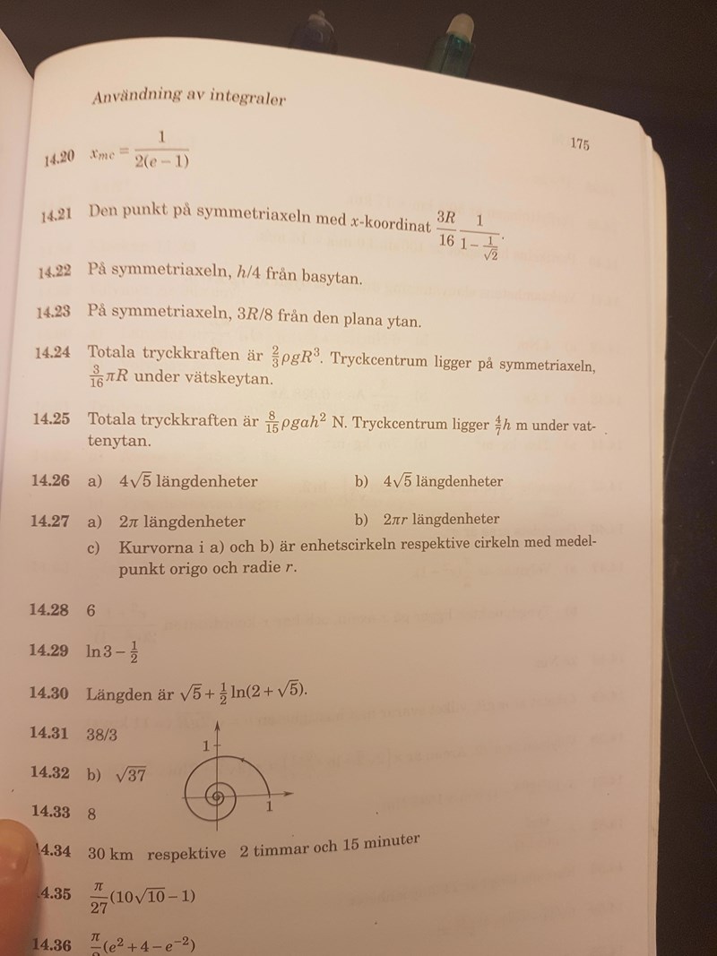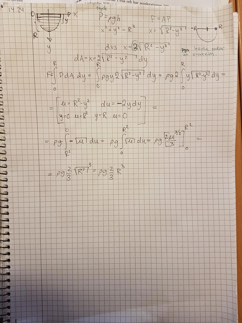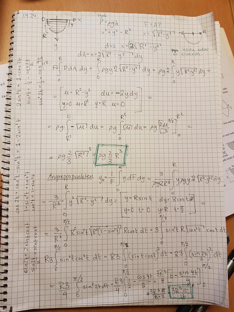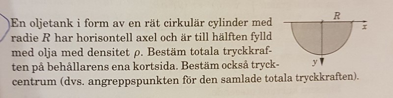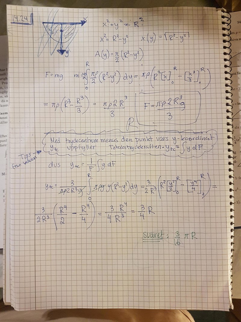 Jag fattar inte vad jag gör för fel. Är det någon som ser? Första delen (tryckkraften) är iaf svaret rätt, men hur får jag till tryckcentrum? Jag får 3R/4 och svaret är 3Rpi/16...