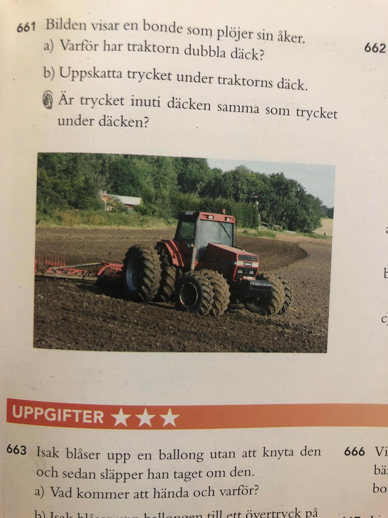 Vad gäller trycket från däcket på marken så beror det endast på däckytan och kraften som trycks ned mot den. Eftersom traktorn är designad för att minimera trycket mot marken (för att jorden inte ska bli ihoptryckt och förstöras) så kommer däcken ha större tryck inuti än utanpå.