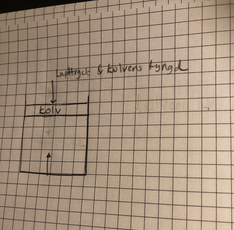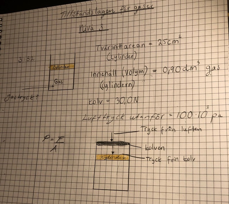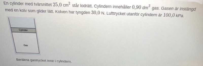 Jag tycker att den ursprungliga bilden är vilseledande. Där det står "cylinder" borde det stå "kolv". Klven är i vila, d v s summan av alla krafter på den är lika med 0. De krafter som trycker kolven neråt är kolvens egen tyngd och lufttrycket. Det som trycker kolven uppåt är trycket från den inneslutna gasen. Kan du rita en ny bild som visar detta?