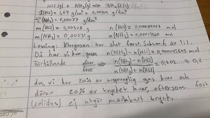 Väteklorid och ammoniak får reagera med varandra. Ett fast ämne bildas. Hur stor är tryckförändringen vid reaktionen om 2,0 dm3 väteklorid och 3,0 dm3 ammoniak förs in i en behållare? Volym och temperatur i behållaren antas vara desamma innan som efter reaktion.