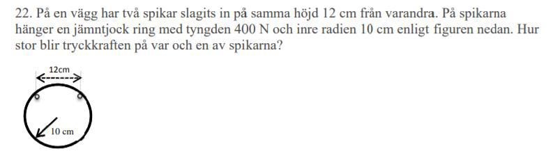 Ture skrev:Med risk att jag vilseleder dig: Du kan försöka med att ersätta ringen med en punktformad massa i ringens medelpunkt och förbinda den med med de två spikarna medelst två 10 cm långa trådar. Rent intuitivt borde det ge samma kraftsituation som den i uppgiften.