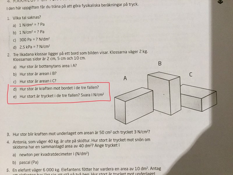 Kraften räknas ut som , där a står för accelerationen, som i detta fall är gravitationsaccelerationen. Trycket räknas ut som . Kommer du vidare?