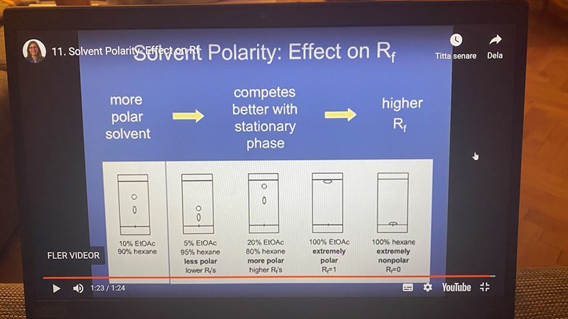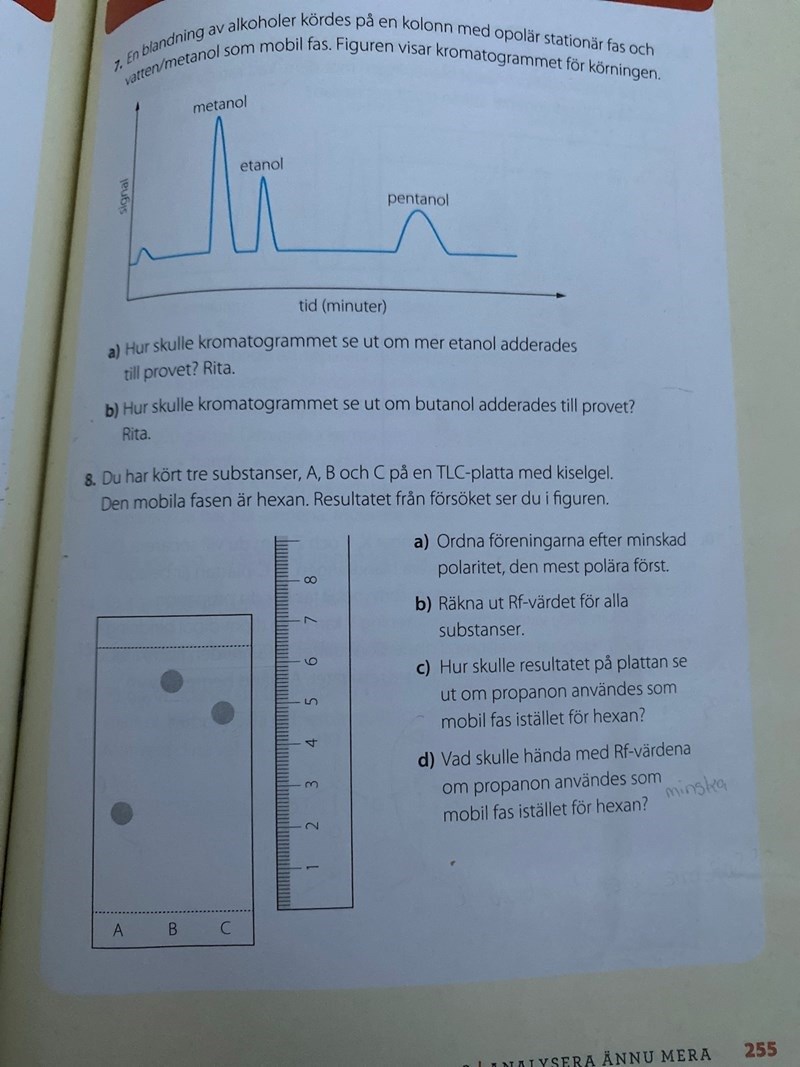 Hej! Jag behöver hjälp med uppgift 8C. Jag tänkte mig att de olika ämnena inte kommer binda lika starkt till den stationära fasen och vandra en längre sträcka om den mobila fasen görs mer polär. Men i facit står det att de vandrar en kortare sträcka. Varför?