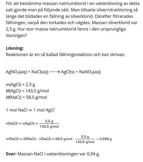 Jo, de tillsätter ju silvernitrat tills det har reagerat med allt befintligt NaCl, och det bildas AgCl motsvarande all NaCl - all NaCl "används upp". Substansmängden för AgCl är ju (som det alltid är) massan över molmassan. Det är alltså kvoten av n(AgCl) multiplicerat med molmassan för NaCl, som blir det samma som massan för NaCl. n= m/M . M *n =m ... Men jag vet inte, det är som att jag behöver förstå mer konkret vad som händer. Massan per mol för NaCl multiplicerat med antalet partiklar AgCl är massan NaCl som fanns från början. Hur mycket en mol NaCl väger multiplicerat med antalet partiklar AgCl, som ju var samma antal som antalet partiklar NaCl, är massan för NaCl, enl M*n=m. Jo, ok.