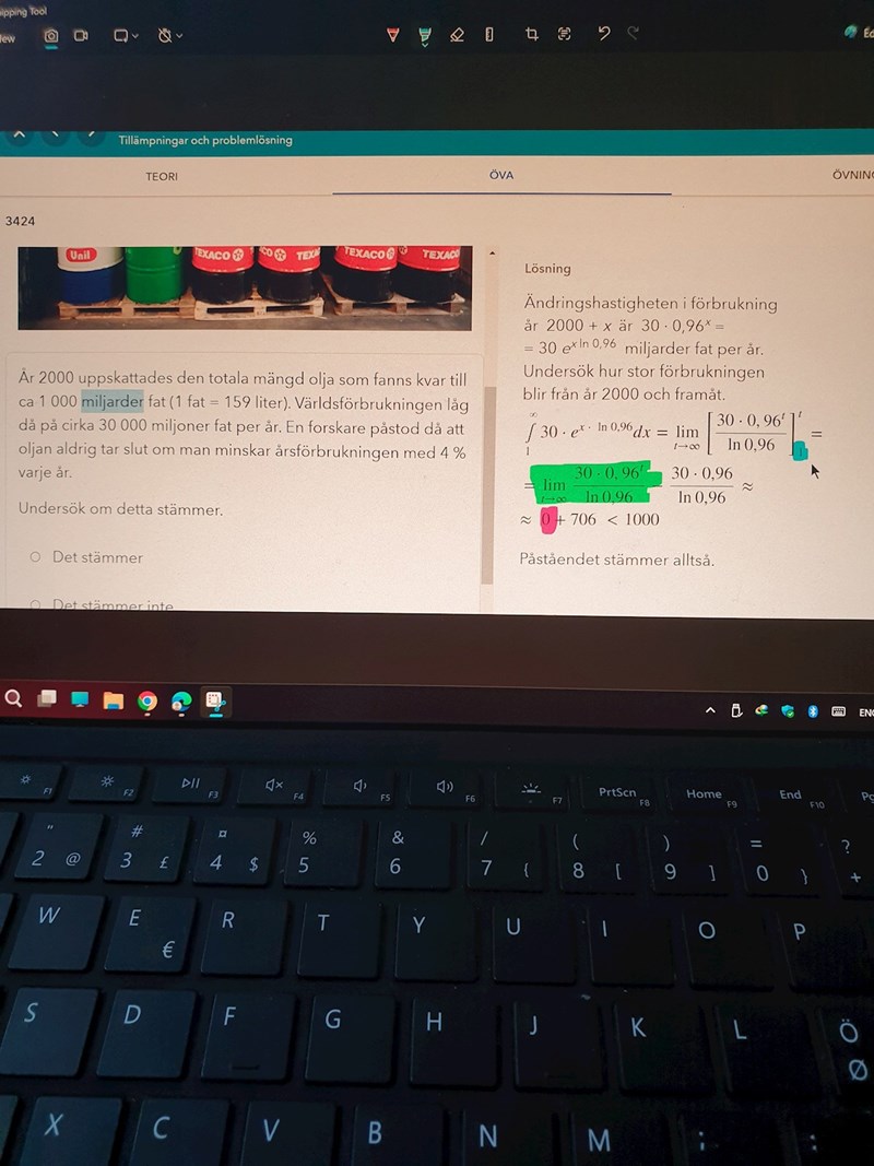 Jag kan hålla med om att integrationen borde börja från 0. I uppgiften har de antagligen tänkt att förbrukningen år 2000 inte räknas med utan de börjar från 2001. Oavsett vad kommer det leda till samma slutsats (testa detta genom att integrera från 0 istället för från 1).