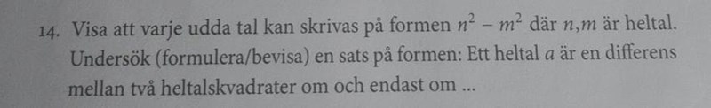Det ser ut som att uppgiften antingen är felformulerad eller en form av kuggfråga. Till att börja med så gäller att n2-m2 inte ger enbart udda tal utan även jämna tal. Sedan frågas efter ett bevis till att a är en differens mellan två heltalskvadrater men det står inget om att a måste bli udda. Differensen kan skrivas a=n2-m2 oavsett värden på m eller n.