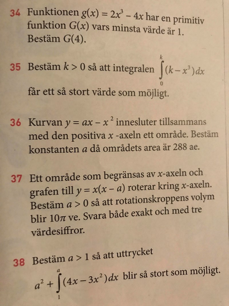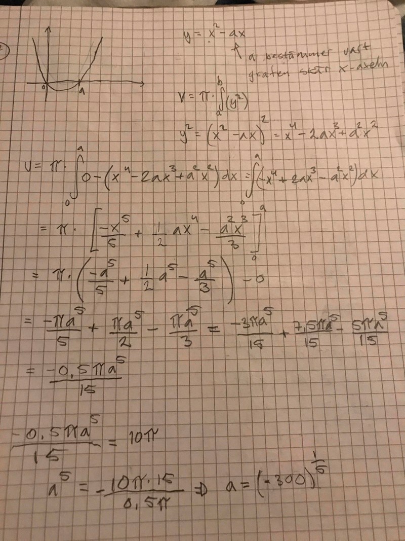 jag höjer upp funktionen y till 2 och sätter in som vanligt i Volym formeln. Men jag får fel i slutet eftersom jag får rätt svar men som negativt. Är det någon snäll själ som kan visa hur man ska räkna? Jag får svaret till (-300)^(1/5) och det ska vara positivt. Tack