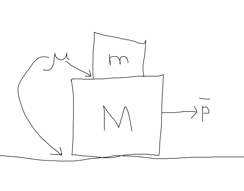 Två Klossar Är staplade på varandra. Det är samma friktion mellan klossarna samt mellan den undre klossen och marken. P är den kraft som påverkar den undre lådan sådan att den övre låden precis Inte glider av.