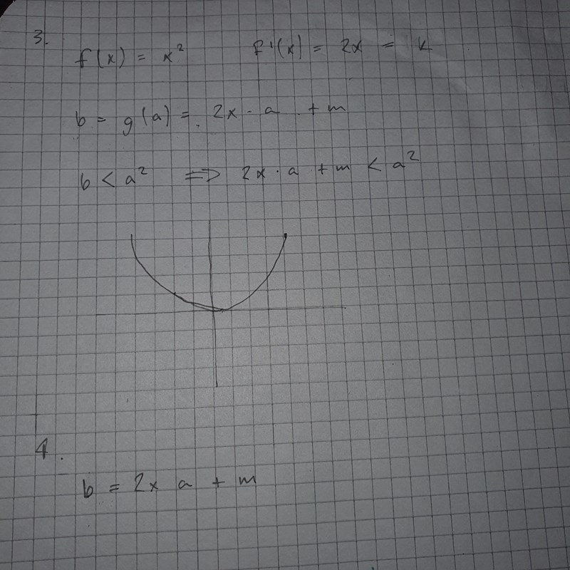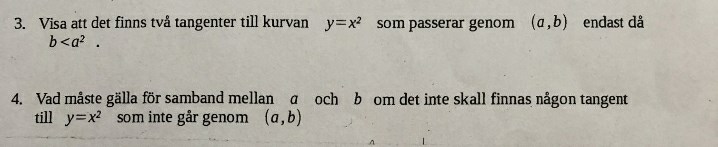 ...vilket inte alls är långt. Fråga 4 har jag svårt att förstå, känns som den är dåligt formulerad. Jag tolkar den som "Vad måste gälla för samband mellan a och b om det alltid ska finnas en tangent till y = x^2 som går genom (a, b)?" Men jag förstår fortfarande inte. En tangent kommer ju alltid passera (a, b). Det är som att säga "Nämn en kurva som passerar (x, y)."