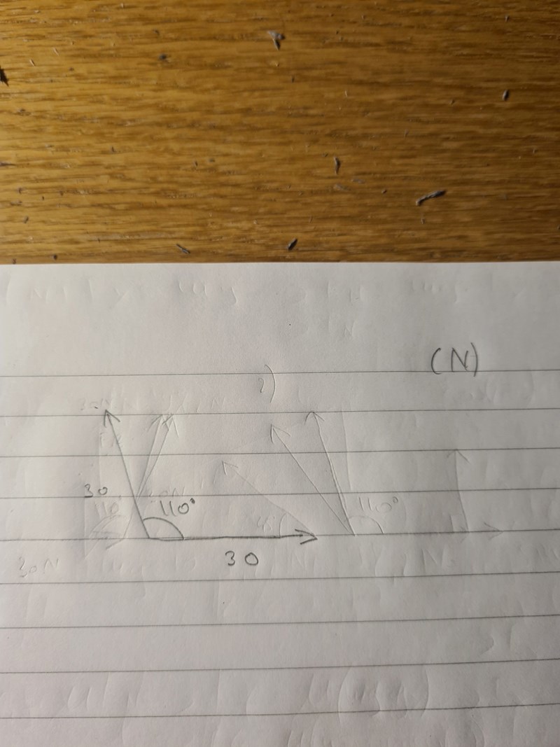 Som rubriken lyder så bildar två krafter på vardera 30 N vinkeln 110° med varandra. Hur stor är den resulterande kraften? Det framgår inte i uppgiften om krafterna har samma utgångspunkt eller om den ena kraften börjar där den andra slutar. Jag har försökt att lösa uppgiften och får att Fr, dvs den resulterande kraften är 49 N, men enligt facit är den resulterande kraften 34 N. Vilket misstag begår jag?