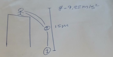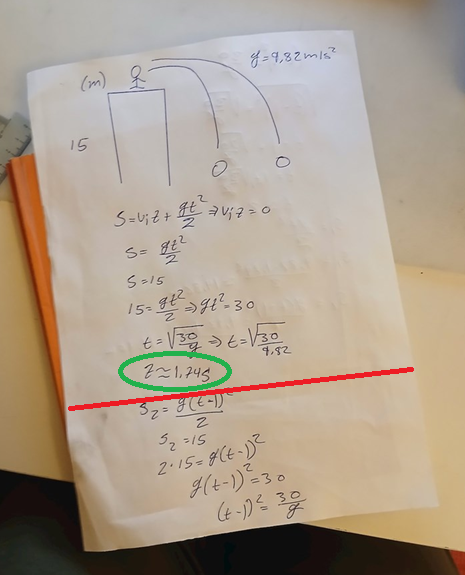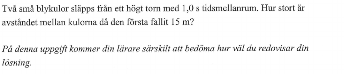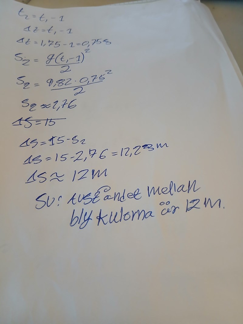 Typ: Kula #1 har fallit fritt i a=g=9,82 m/s2 under s1=15 meter. Vi söker tiden t1 det tar: s1=15=at12/2.