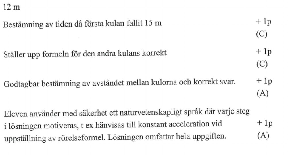 Svar: När kula #1 fallit 15 meter är avståndet mellan kulorna ca 12 meter.
