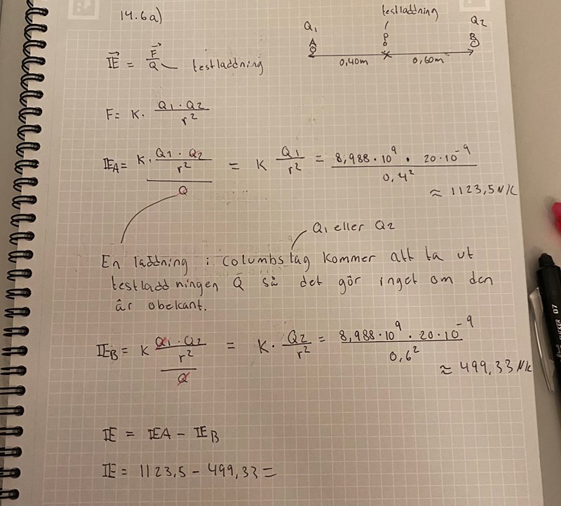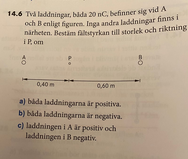 Eftersom alla tre laddningarna ligger på samma räta linje kan kraften på testladdningen bara vara "åt höger" eller "åt vänster". I a-uppgiften är båda laddningarna positiva, så de försöker repellera testladdningen, alltså kraften från A pekar åt höger och kraften från B pekar åt vänster.
