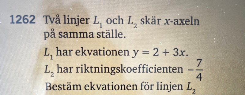 Hannasiri skrev:Om de skär x-axeln på samma ställe, och du har räknat ut att L1 skär x-axeln i (0.66;0), då vet du ju också att L2 kommer att gå genom punkten (0.66;0)... Utifrån den informationen, samt att du vet att L2 har riktningskoefficienten -7/4, så bör du kunna ställa upp en ekvation för att lösa frågan:)