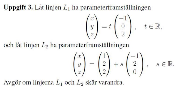 Jag ställde upp ekvationen (1, 2, 2) + (-s, 2s, 0) = (-1, 0, 2)