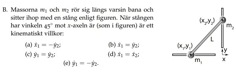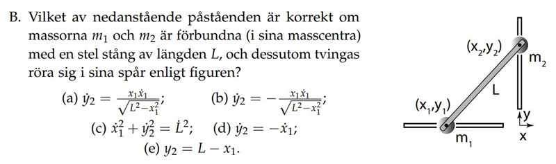 Har fastnat för två liknande uppgifter i mekanik. Rätta svar för båda uppgifterna är b). Jag gjorde pythagoras sats: x1^2+y2^2=L^2. Sedan löste ut x1 och y2 och deriverade dessa. Men derivatan av y2=-x1/sqrt(L^2-x1^2). Jag förstå inte vad den extra x´1 på täljaren i den första uppgiftens svar b) kommer ifrån.