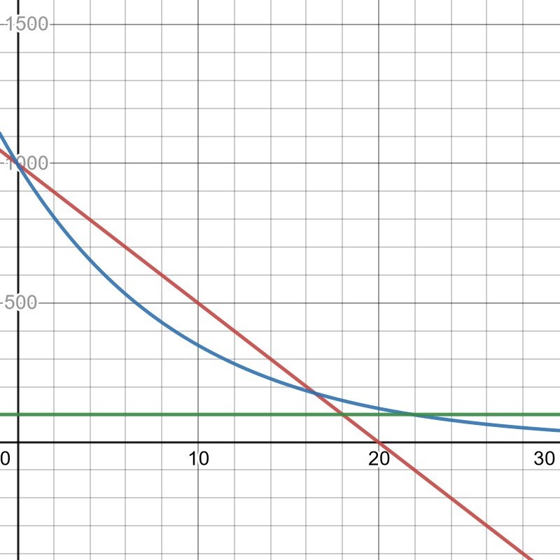 Välkommen till Pluggakuten! Hur långt har du kommit själv på uppgiften? Har du t ex ritat upp de båda funktionerna på en grafritande räknare? (Jag antar att den andra funktionen skall vara y = 1000.0,9x.)