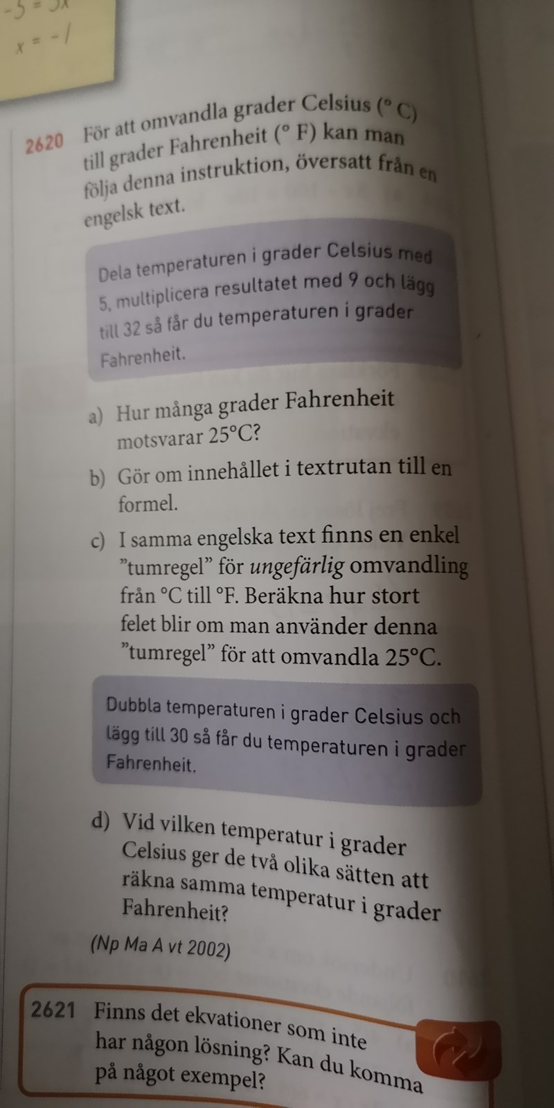 Har gjort det och fick ekvationen x/5×9+32 = 2x+30