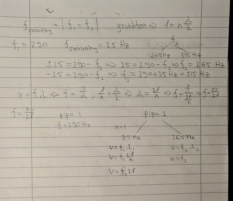 Jag har påbörjat uppgiften men har fastnat litegrann. Den ena pipans frekvens är hela tiden 290 Hz. Om svävningsfrekvensen är 25 Hz har den andra pipan antingen frekvensen 265 Hz eller 315 Hz.