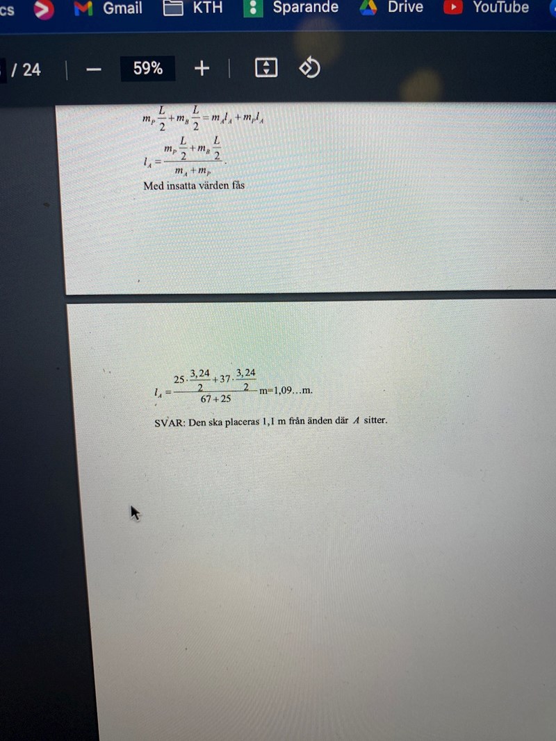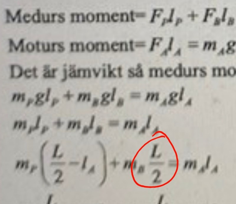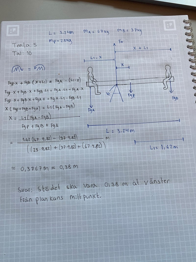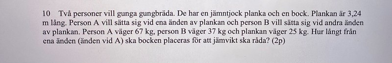 Jag förstår inte vad jag gjort för fel när jag räknar ut denna uppgift. Mitt svar blir att stödet ska vara 1,2m från där person A sitter men facit får det till 1,1 m.
