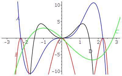 Sedan är kommer . Här är det bra att tänka på att alla tal gånger noll blir noll. Det innebär att måste ha samma nollställen som dess faktorer, dvs. ett mellan -3 och -2, ett i origo, och ett mellan 2 och 3. Då kvarstår endast alternativ A och B. Vi kan nu göra något liknande som vi gjorde ovan. Vad händer med produkten i de olika intervallen, blir den positiv eller negativ? Vi ritar: