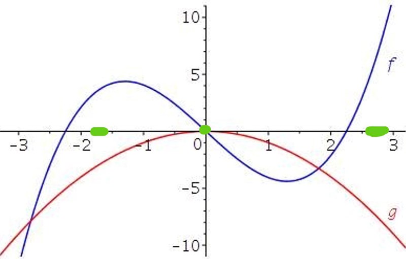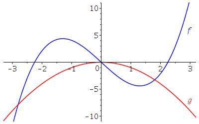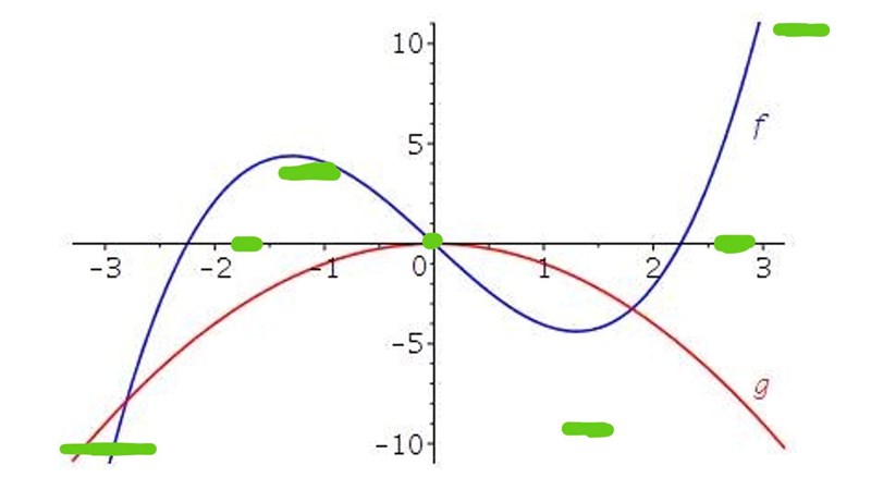 Två polynomfunktioner f(x) och g(x) är plottade nedan:
