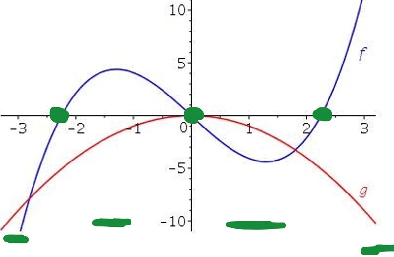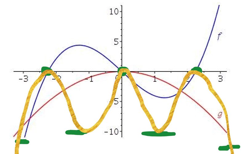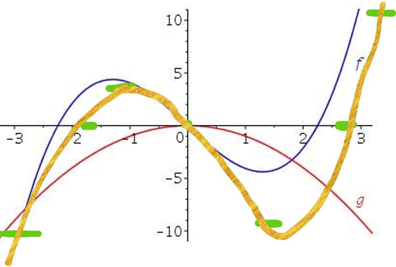 Då kvarstår och . Vi kan försöka hitta ungefärliga uttryck för f och g, men det lättaste är nog att undersöka nollställena. Välj en punkt på f, säg (enkelt att välja nollställen). Där vet vi att . Vad är då ? Det kan vi läsa av som noll. måste alltså vara ett nollställe till .