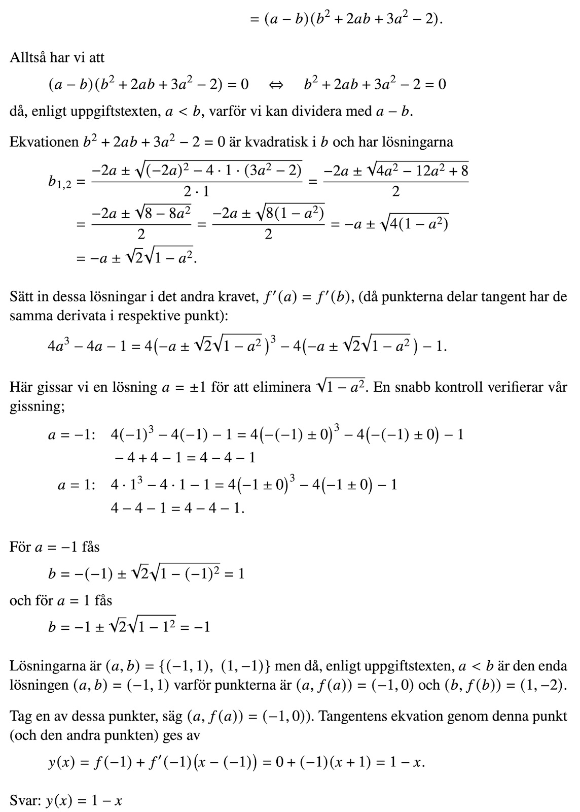 y´=4x3-4x-1=-1 , och därmed x=0,-1 och +1. insättning i funktionen ger för -1 och +1 att den blir 0 och -2. Så linjen mellan punkterna har lutningen -1, som var derivatan i dessa punkter. Fult men med utnyttjande av tipset.
