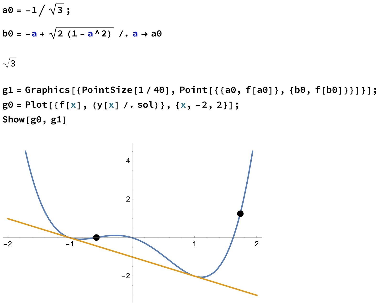 Kanon. Notera att det finns en lösning till, a=-1/sqrt(3) och jag har ej motiverat varför den inte är aktuell algebraiskt, men man ser direkt på grafen att denna punkt och tillhörande b ej är kandidater.