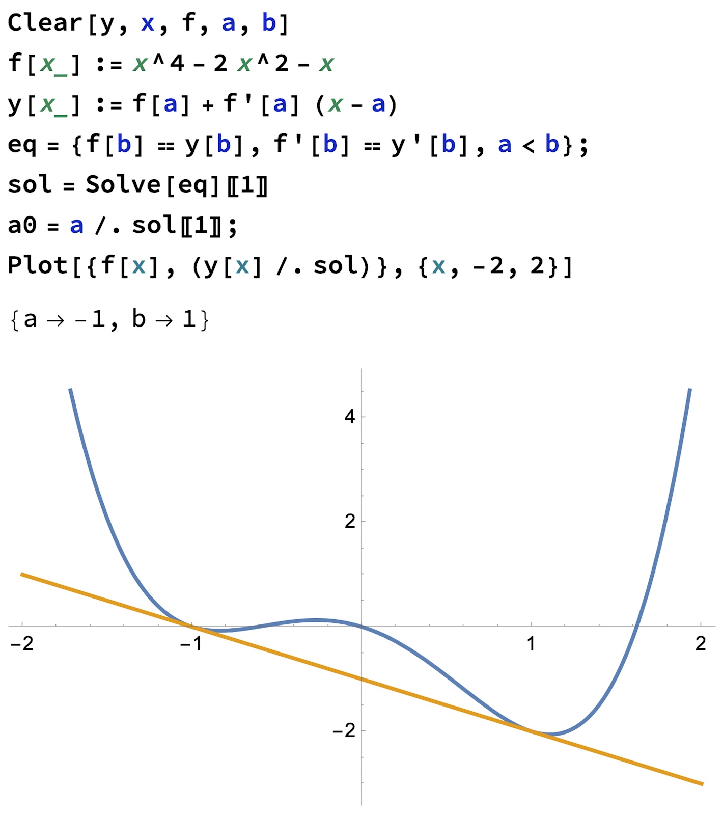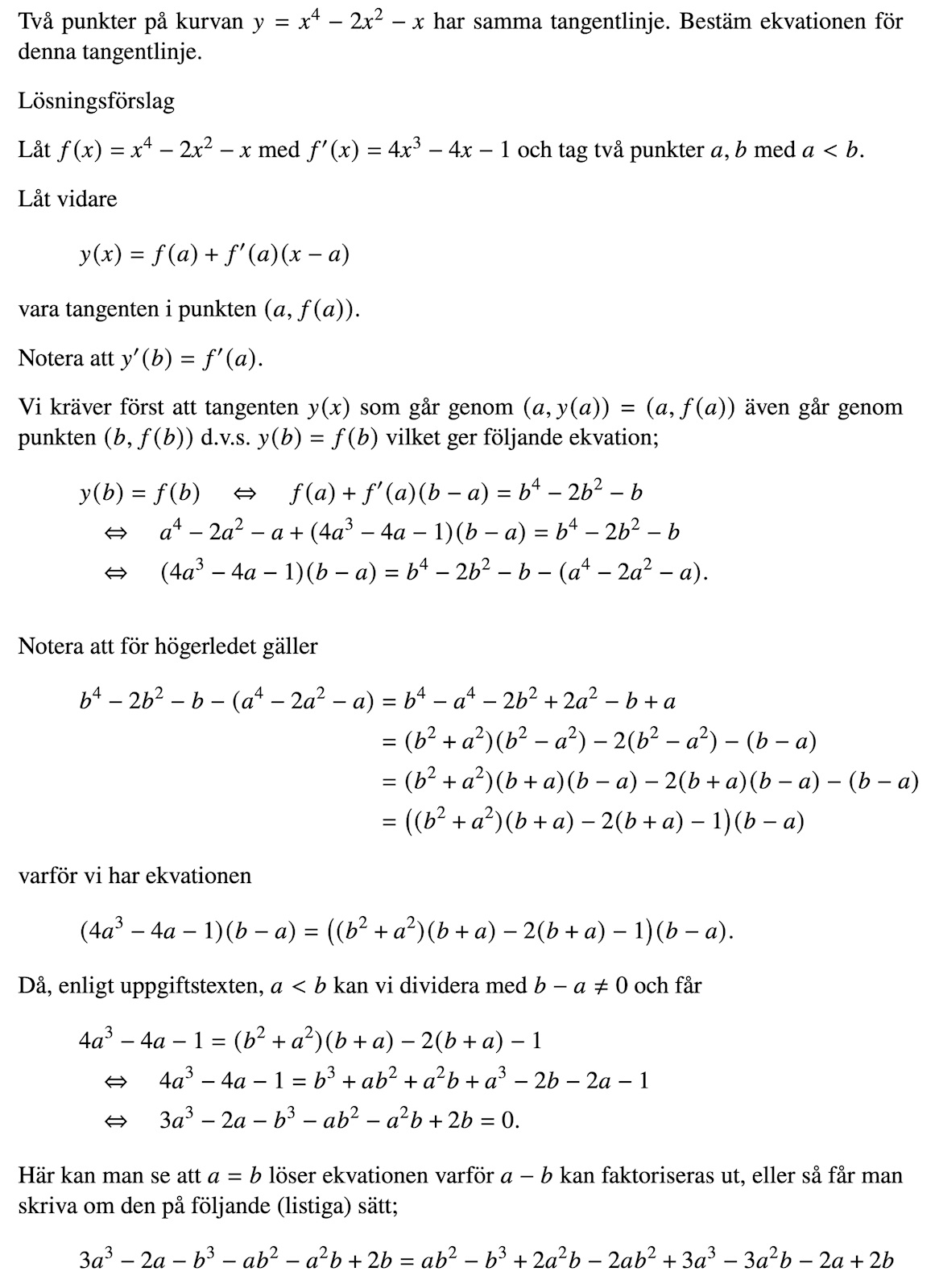 y´=4x3-4x-1=-1 , och därmed x=0,-1 och +1. insättning i funktionen ger för -1 och +1 att den blir 0 och -2. Så linjen mellan punkterna har lutningen -1, som var derivatan i dessa punkter. Fult men med utnyttjande av tipset.
