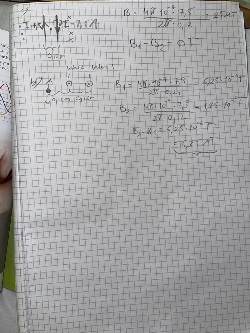Två raka parallella ledare är monterade vertikalt på en vägg och avståndet mellan dem är 12 cm. Strömmen är 7.5A i vardera ledare, riktad uppåt i den vänstra ledaren och nedåt i den högra. Bestäm den magnetiska flödestätheten B, till storlek och riktning: