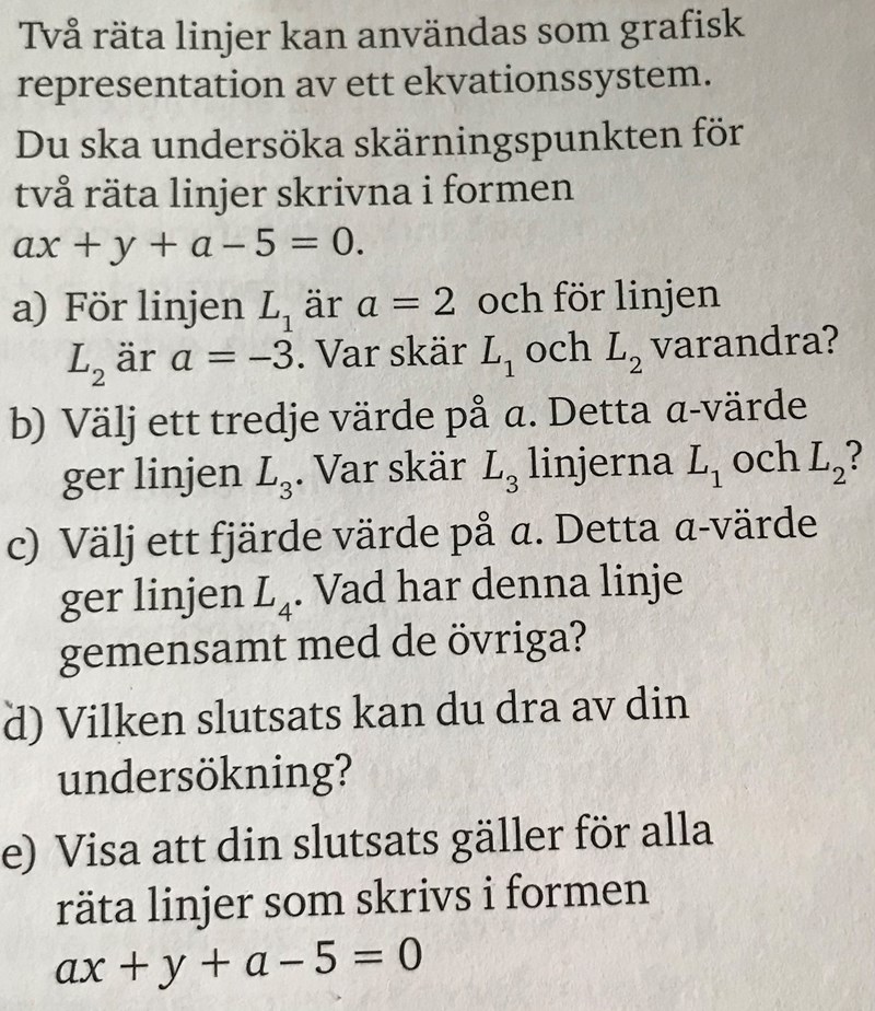 a) Sätt in att a = 2 respektive att a = -3. Kan du räkna ut var linjerna skär varandra? Du kan antingen rita in linjerna i ett koordinatsystem, eller lösa det algebraiskt.