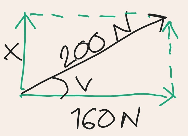 Rita en figur där du delar upp kraften på 200 N i två vinkelräta komposanter. Den ena komposanten är 160 N. Kalla den andra komposanten för x.