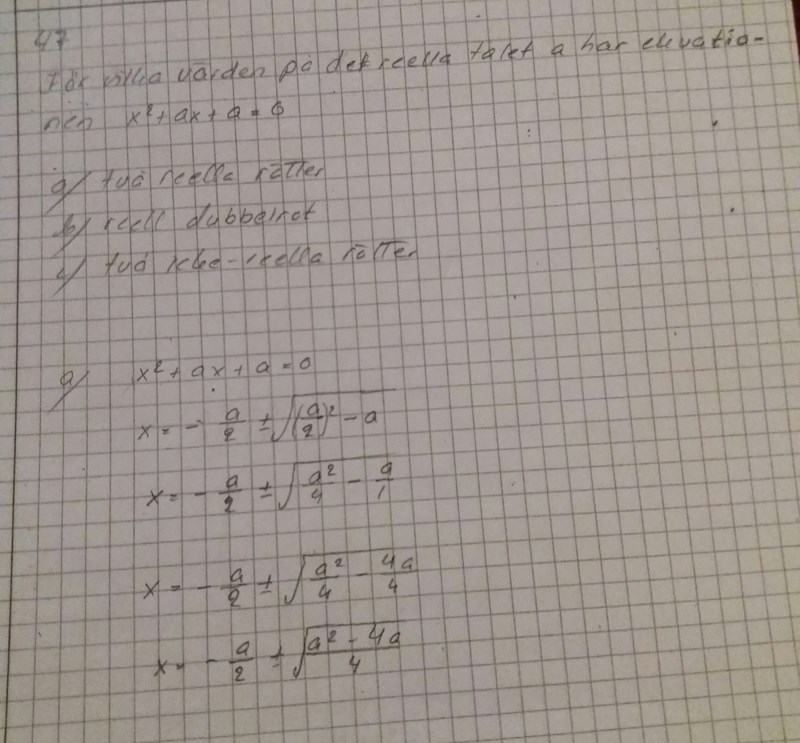 Maarit skrev :Hur ska jag få två reella rötter av det här, undrar jag? Jag är dålig i matte. Jag vet att två reella rötter betyder att man ska få fram två nollställen. Jag tror att detta handlar om diskriminanten det som är under rot tecknet och i täljaren. Behöver mycket ledtråd för att kunna lösa uppgiften eller något liknande.