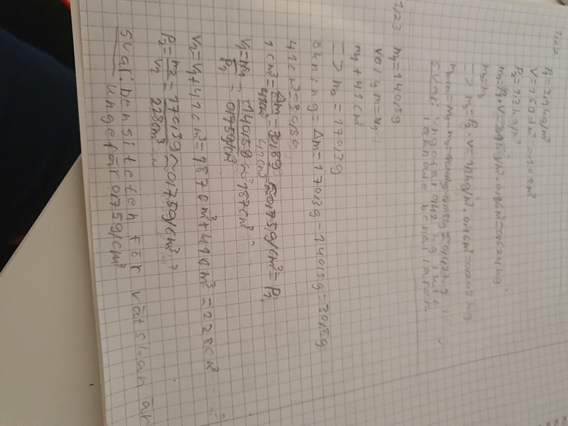 Ett mätglas med en viss volym av en vätska står på en våg som visar 140,5g. Då 41cm³ av samma vätska hälles i mätglaset ökar massan hos mätglaset med inehåll till 171,3g. Beräkna vätskans densitet.