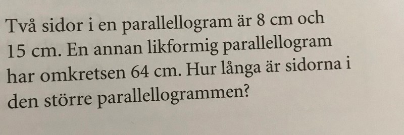 Om den långa sidan är x och den korta sidan är y, så är x/15 = y/8 eftersom de båda parallellogrammen är likformiga. Man kan också skriva att x/15 = y/8 = k så x = 15k och y = 8k.